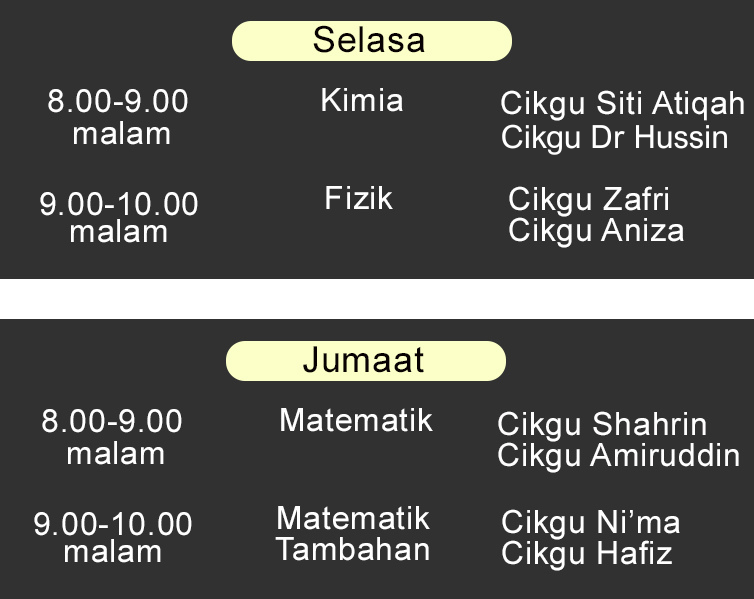 Bukan tutor biasa. Tenaga pengajar terdiri daripada Guru Sekolah , Ketua Panitia , Guru Pakar Subjek , Pensyarah Universiti